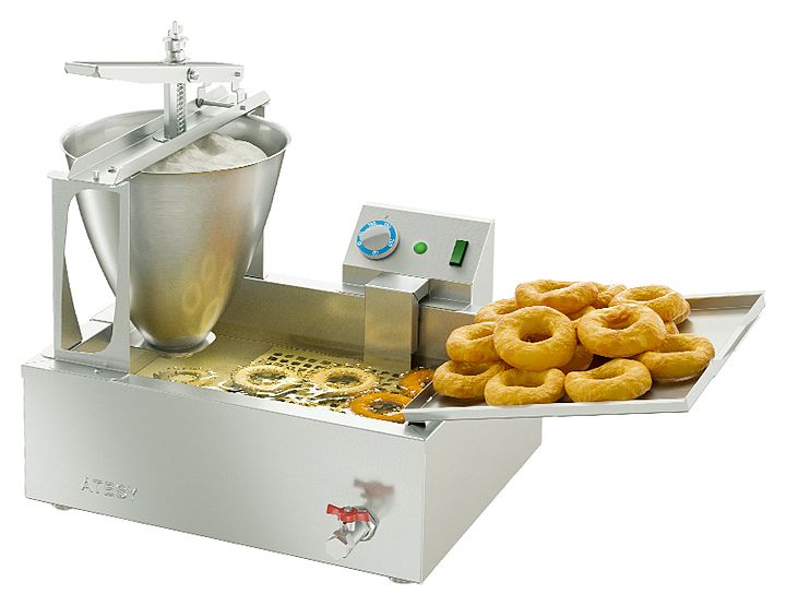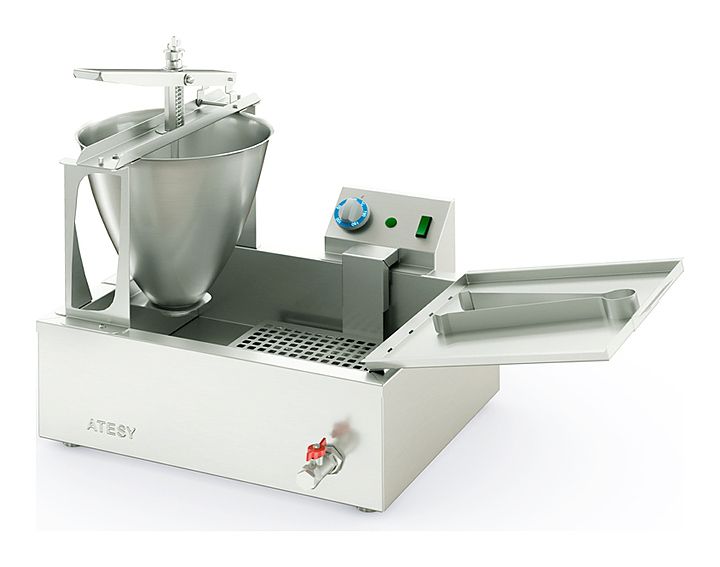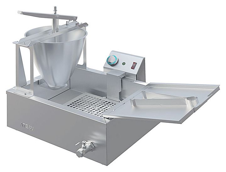 Все части пончикового аппарата изготовлены из пищевой нержавеющей стали. Аппарат состоит из фритюрной ванны, ручного дозатора теста, блока управления с электронагревателем и поддона для выкладки готовых пончиков. Ванна размером 400х315х115 мм имеет маркировку уровня масла (max и min) и кран для слива масла. Жарка пончиков происходит в масле (фритюре) при температуре 190ºС, для чего масло заливается во фритюрную ванну и нагревается ТЭНом. Температура нагрева масла регулируется терморегулятором, находящимся в блоке управления нагревом. Ручной дозатор формирует пончик стандартного размера и веса, который падает в разогретое масло и поджаривается до готовности с одной стороны, а после переворачивания его кулинарным пинцетом – с другой. Готовность пончика определяется визуально. Признаком готовности служит ярко-золотистая корочка на поверхности пончика. После обжарки готовые пончики выкладывают на специальный поддон, установленный на борту ванны. Отверстия в поддоне позволяют излишкам масла стекать обратно в ванну, что обеспечивает существенное снижение расхода масла. Дозатор пончиков изготовлен из пищевой нержавеющей стали, легко разбирается и моется в посудомоечной машине. Он имеет оригинальную конструкцию, запатентованную компанией АТЕСИ и способен формировать пончики правильной формы и одинаковой массы из теста любой консистенции.