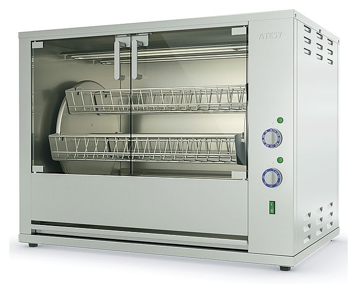 Корпус гриля изготовлен из пищевой нержавеющей стали AISI430. Гриль карусельного типа загрузкой до 18 кур. Куры размещаются внутри гриля на шести легкосъемных садках (люльках), изготовленных из нержавеющего прутка. Садки вращаются вокруг центральной оси внутри рабочей камеры. Механизм торможения позволяет четко фиксировать положение садков во время остановки вращения, исключая проворот при несимметричной загрузке. Приготовление продуктов осуществляется посредством инфракрасного излучения ТЭНов, расположенных на передней, задней и верхней частях рабочей камеры. Каждый ТЭН имеет отражатель, повышающий эффективность нагрева продукта. Интенсивность нагрева плавно регулируется терморегулятором, ручка которого расположена на передней панели гриля. Гриль оснащен таймером до 120 минут, который отключает нагрев камеры по окончании установленного времени, издав звуковой сигнал. На дне рабочей камеры расположен поддон для сбора влаги и жира, стекающего с кур. Две двери, выполненные из закаленного стекла, позволяет наблюдать за процессом приготовления. В закрытом положении двери фиксируются магнитными защелками. Угол и положение открытых дверей не препятствуют выемке садков с курами. В гриле можно приготовить не только целые тушки кур, но и отдельные части: крылышки, бедра, грудки.